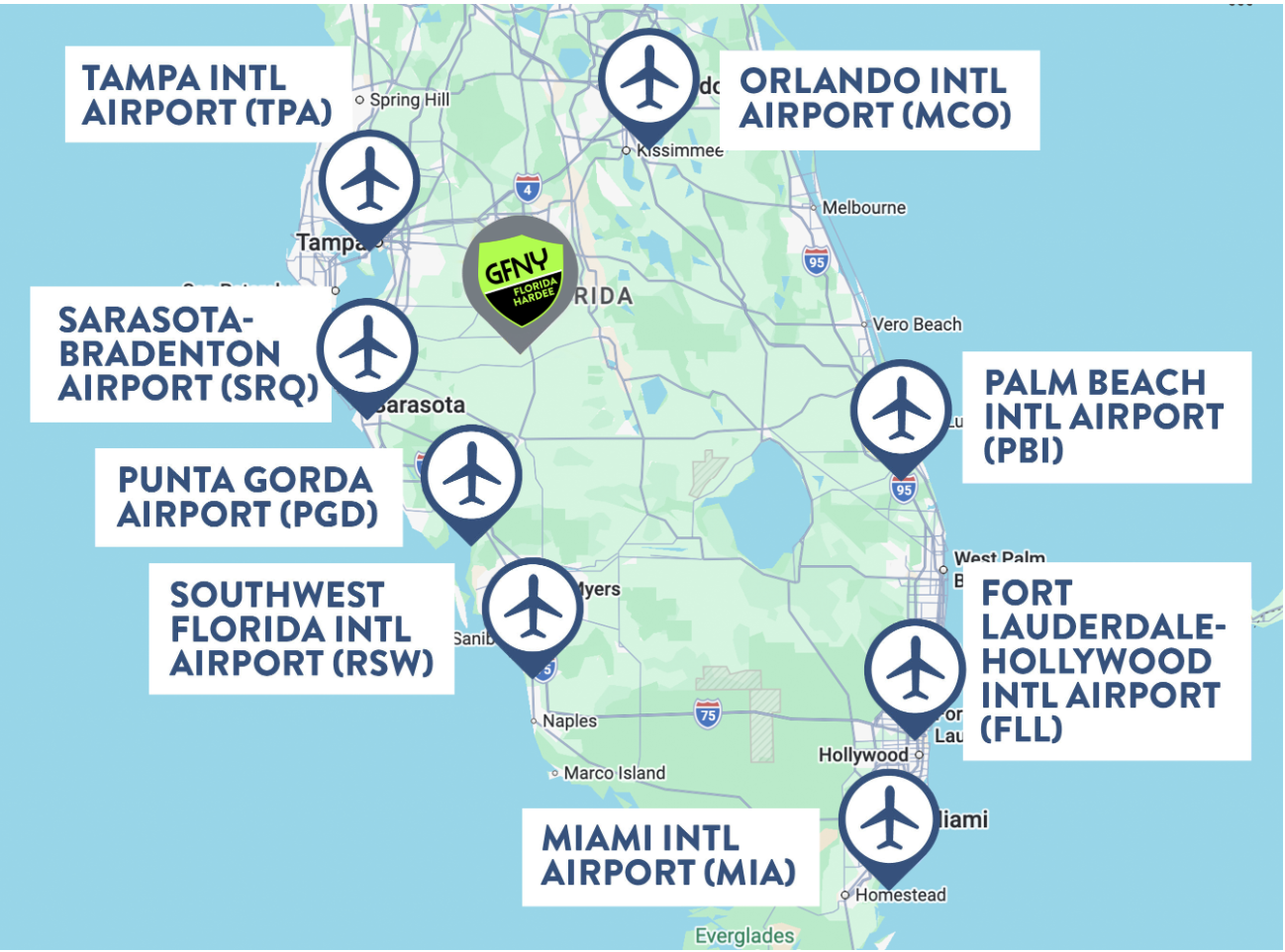 Many car rental options are available at each airport to make your trip to Hardee fast and easy. Here are the distances to Hardee from the nearby airports: